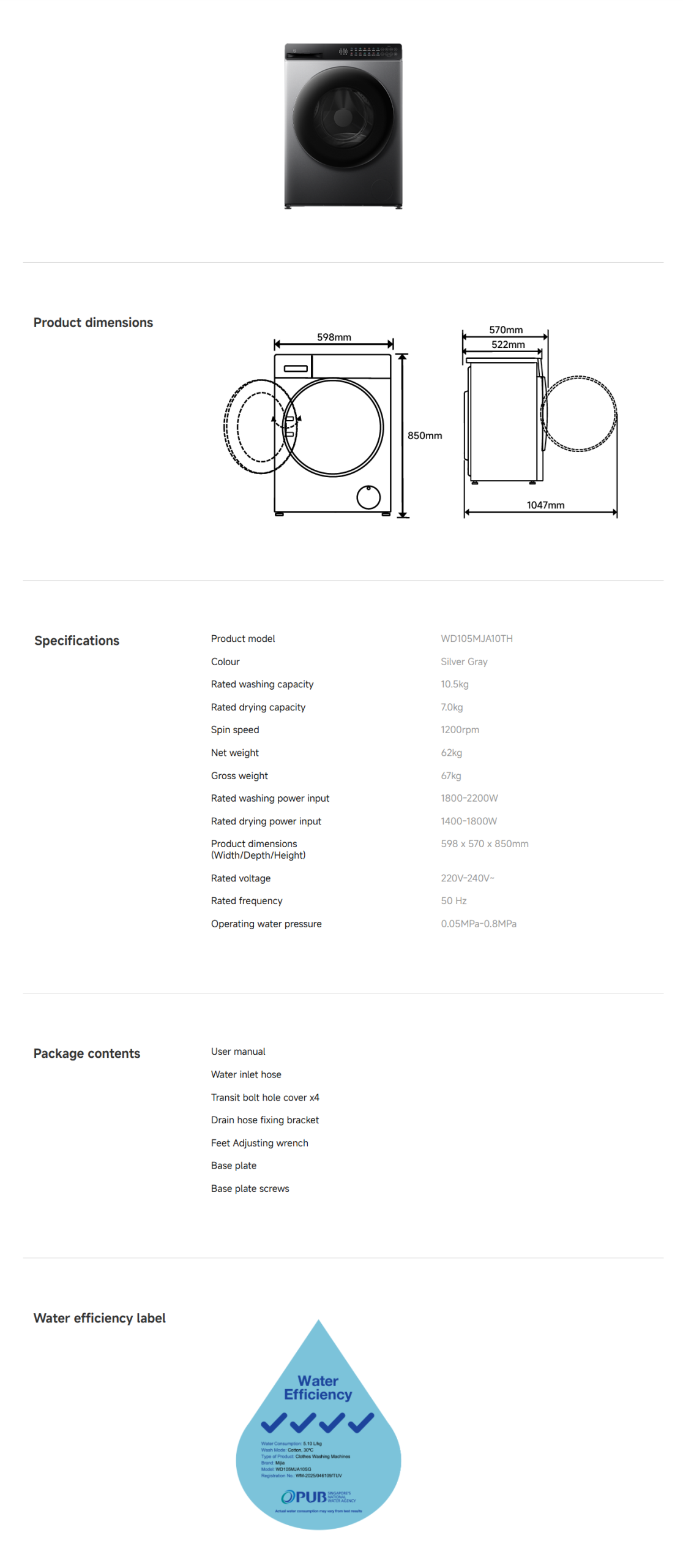 Large Capacity: 10.5 kg wash / 7 kg dry — ideal for family use.