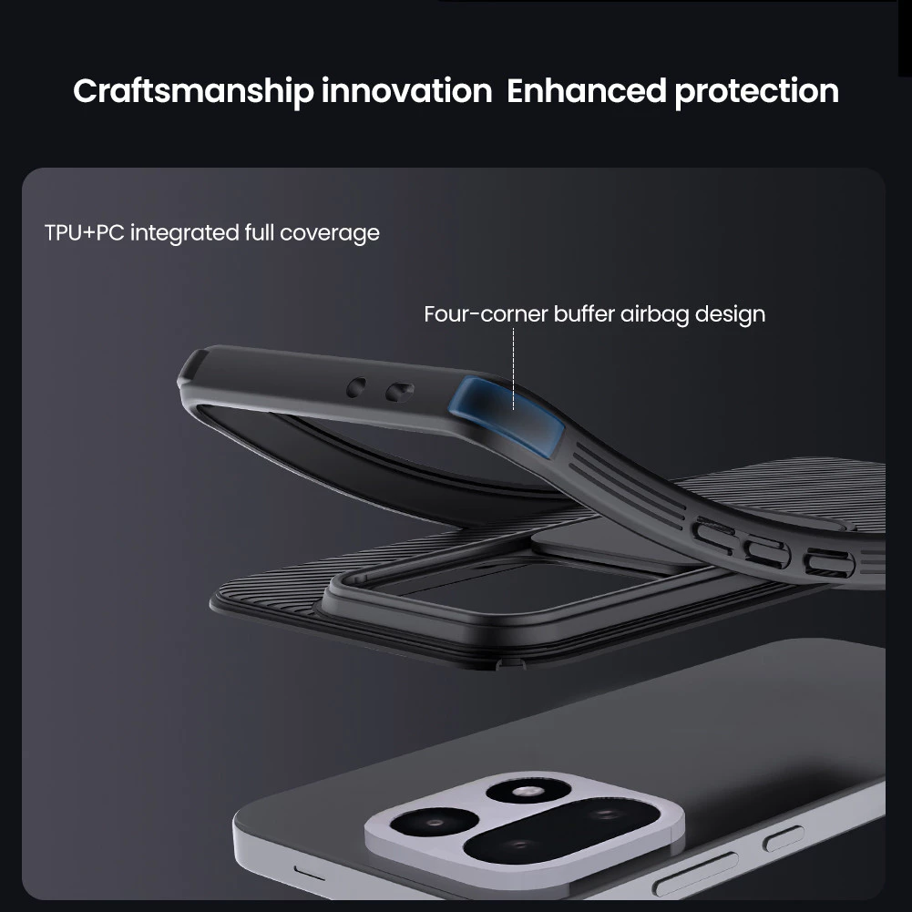 CamShield Pro case combines with classic, fashion and protective elements. Slide cover protects phone camera from scratch, and protects your privacy. Made of environmentally friendly PC and TPU material, which is tough and wear-resistant. Processed by advanced technology. Good touch feeling. Anti fingerprint and oil stain. One-piece molding, completely fits your device. Provides reliable protection. Impact resistant airbags on four corners. All around coverage.