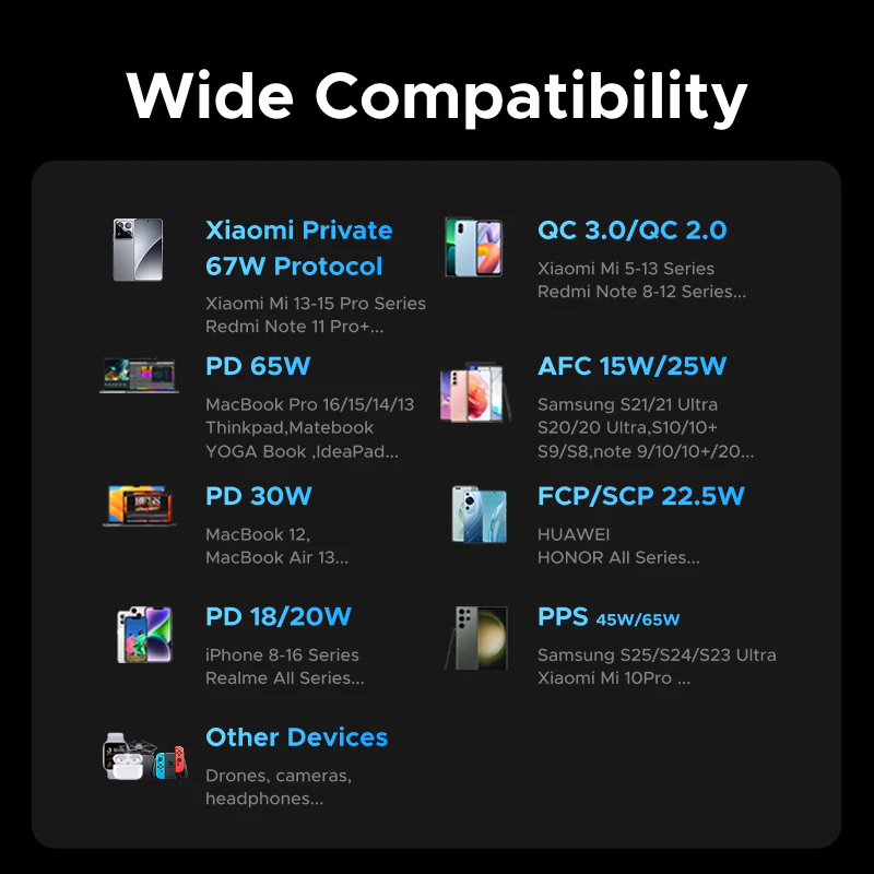 * Output specification USB-C3 cable/C1 port: 10V/2.25A 5V/3A 9V/3A 12V/3A 15V/3A 20V/3.35A 67W Max (PPS: 5-11V/5A, 5-21V/3.2A)